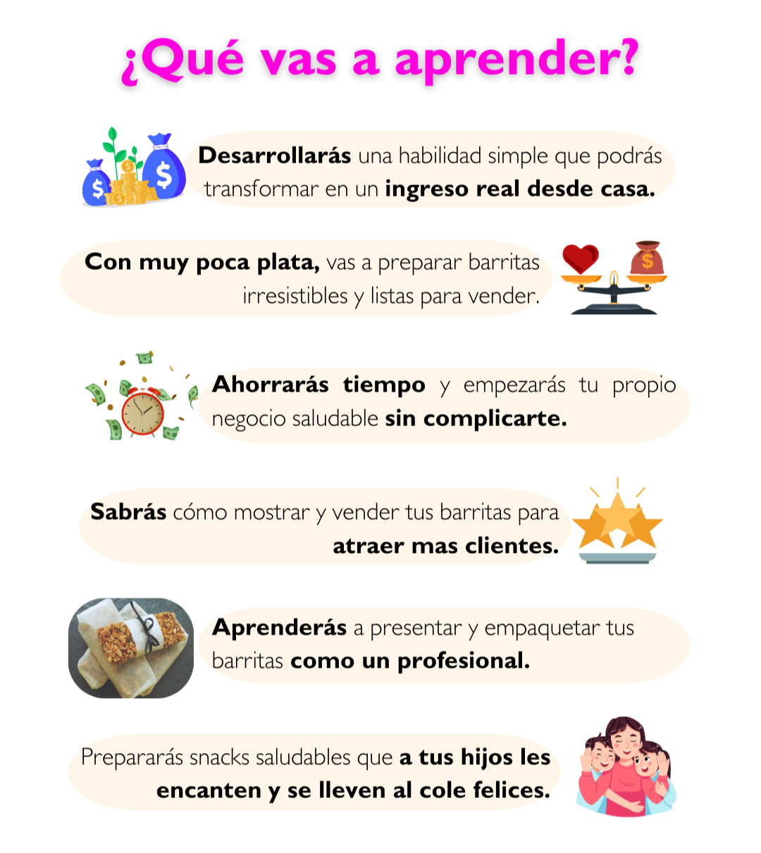 - Podés hacer barritas para tu familia o para emprender tu propio snack saludable.
